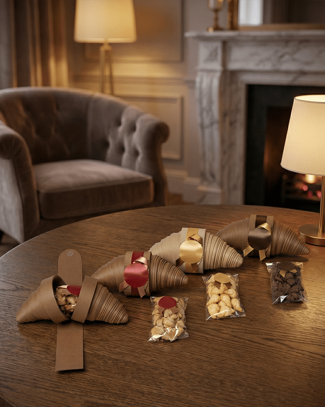 An innovative croissant-shaped packaging design for sweets and nuts gives the product a striking and fun appearance, making its presentation more distinctive and attractive.